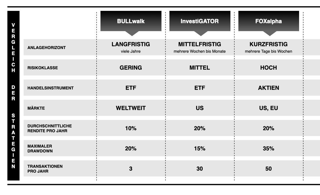Wir haben verschiedene Handelsstrategien entwickelt, die wir für unsere eigenen Anlagen einsetzen und nun auch unseren Kunden anbieten. Diese sind aufwendig getestet worden und werden sowohl durch unsere eigene Software als auch durch manuelle Analysen permanent betreut und optimiert. Sie folgen jeweils unterschiedlichen Anlagestilen, die aber auch kombinierbar sind. So kann es zum Beispiel Sinn machen, einen großen Teil des verfügbaren Kapitals mit der sehr konservativen BULLwalk-Strategie für einen langfristigen Kapitalaufbau zu investieren, einen weiteren Teil mit InvestiGATOR in aktuell boomende Märkte zu stecken und gleichzeitig mit einem kleineren Anteil des Kapitals ein paar Einzelaktien mit der FOXalpha-Strategie zu kaufen.