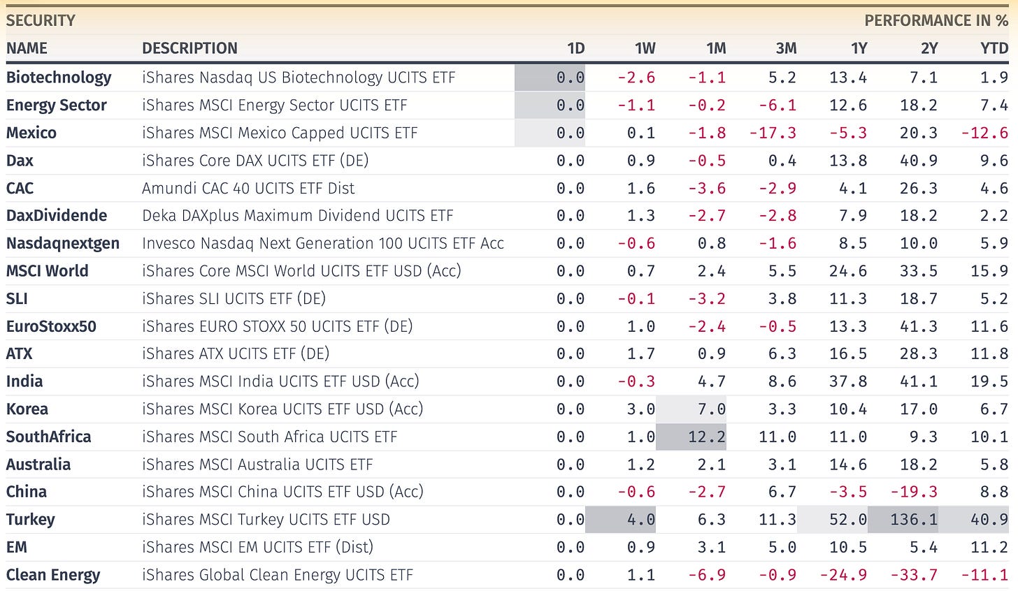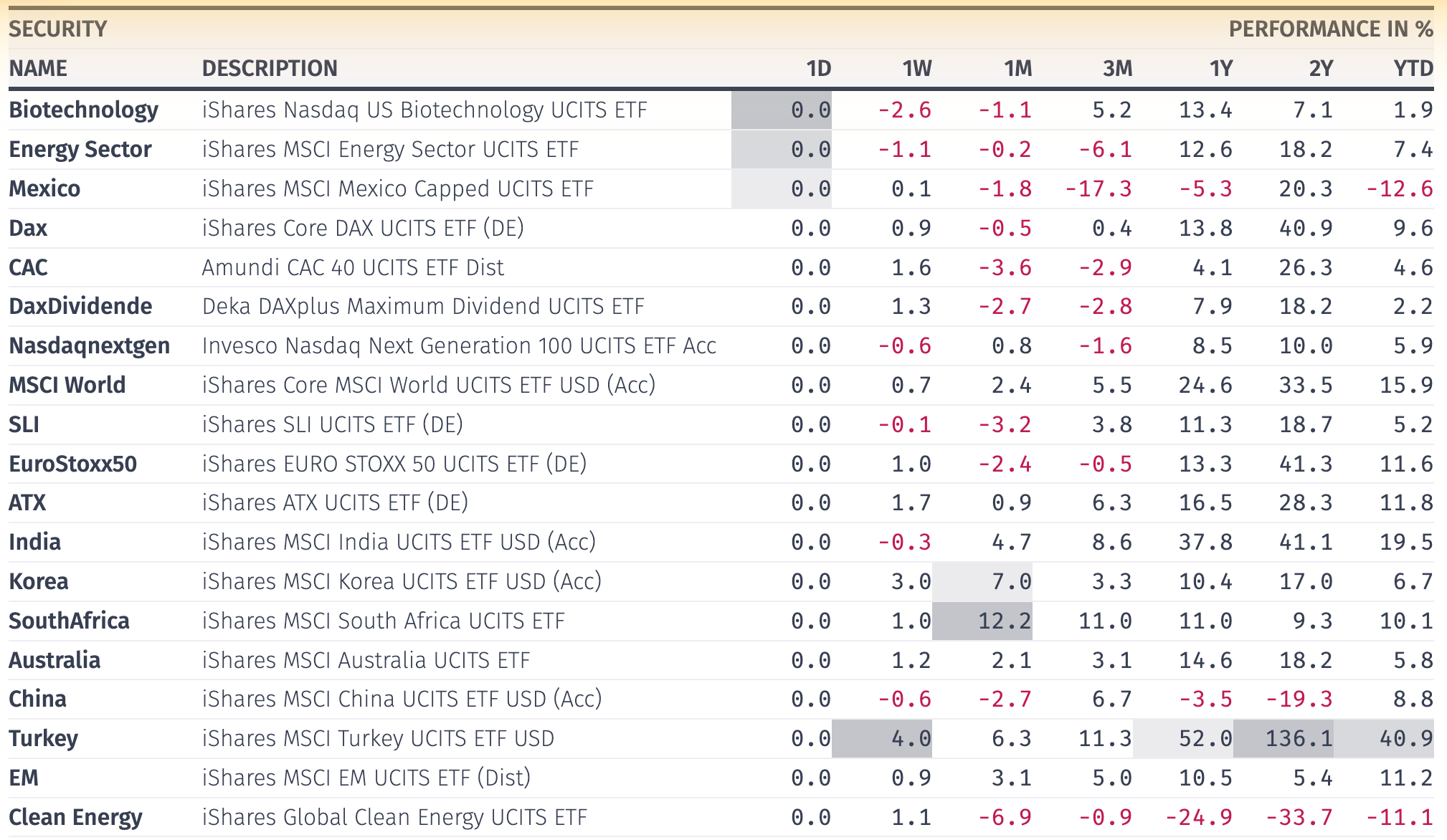 Die Übersicht aktualisiert sich täglich automatisch und enthält damit immer aktuelle Daten für die einzelnen Zeiteinheiten für alle in Euro basierten dargestellten ETFs.