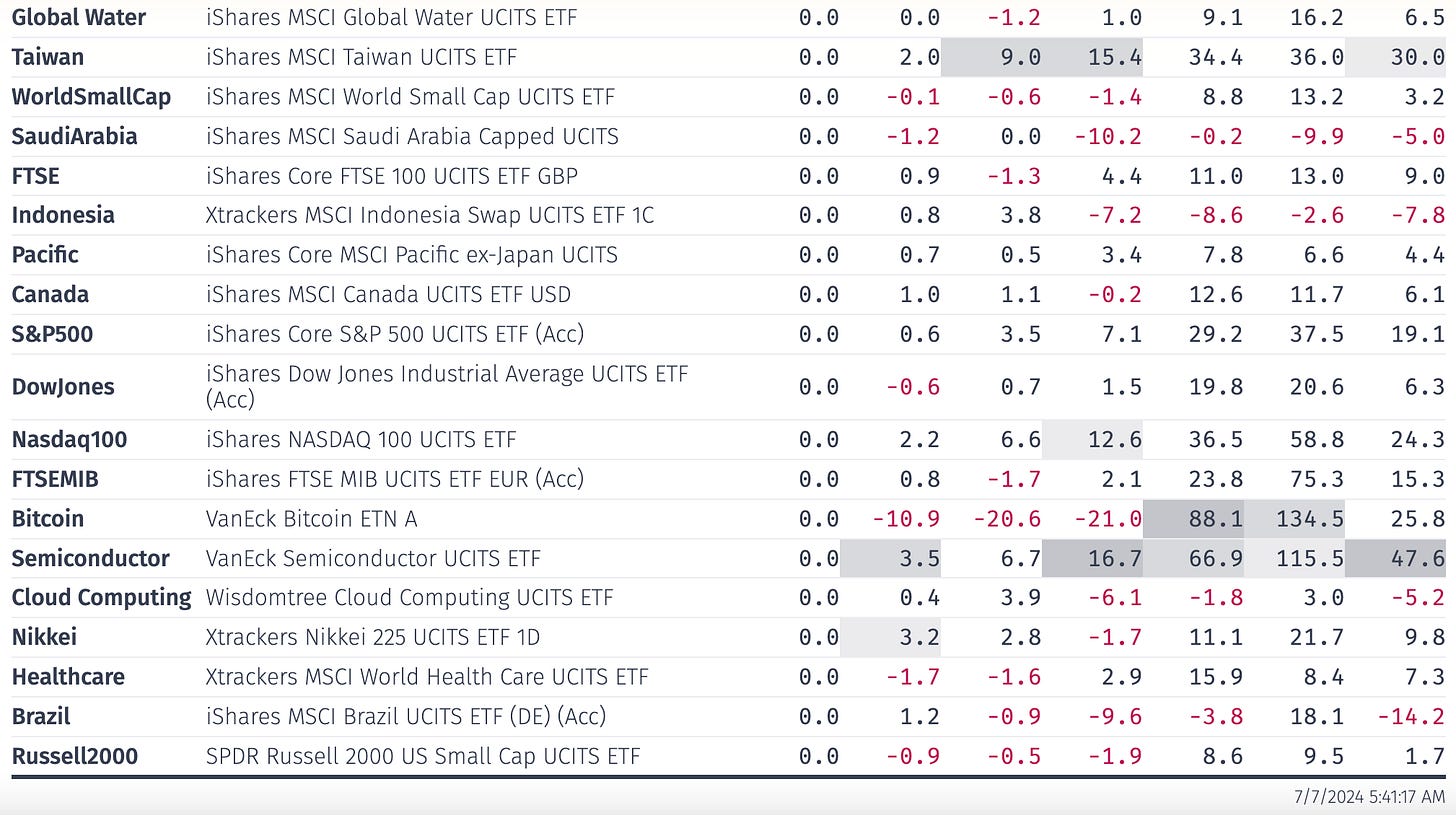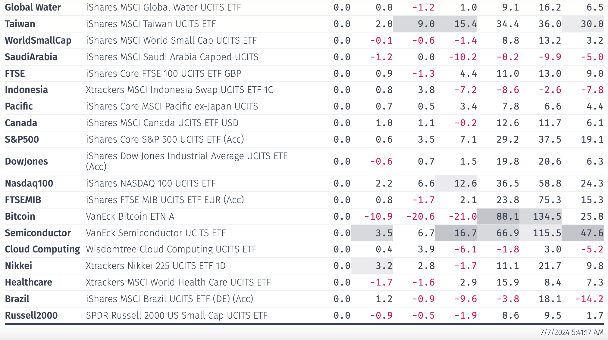 Beispiel: Für den 3 Monatszeitraum hat der ETF VanEck Semiconductor die beste Performance mit 16,7% Rendite, gefolgt vom iShare MSCI Taiwan UCITS mit 15,4% und dem iShare Nasdaq100 UCITS ETF mit 12,6% Wertsteigerung.