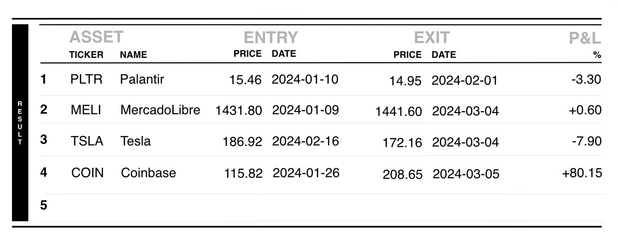 Unsere Transaktionen, also alle Käufe und Verkäufe sind in der folgenden Tabelle mit Kauf- und Verkaufsdatum und Performance in Prozent dargestellt.