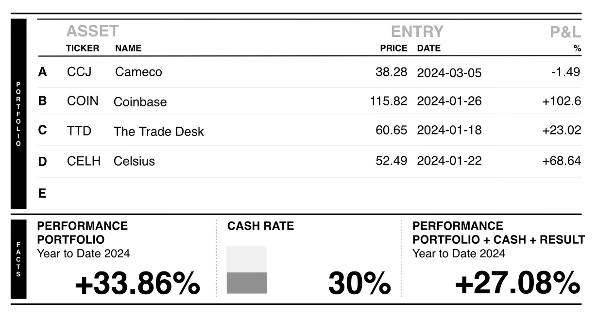 Wir sind inklusive 30% Cashanteil und allen durchgeführten Transaktionen, seit Jahresanfang 2024 bei +27,08% Gewinn vor Steuern. Ein sehr guter Wert!