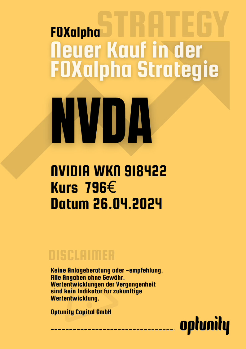Neuer Depotkauf am 26.04.2024 für das FOXalpha Portfolio. Die Optunity Engine hat ein neues risikominimiertes Einstiegssignal für Nvidia generiert. Wir kaufen für 20% vom Gesamtportfolio eine Position in Nvidia mit der WKN 918422 für 796€. Der Cashanteil reduziert sich damit von 50% auf 30%.