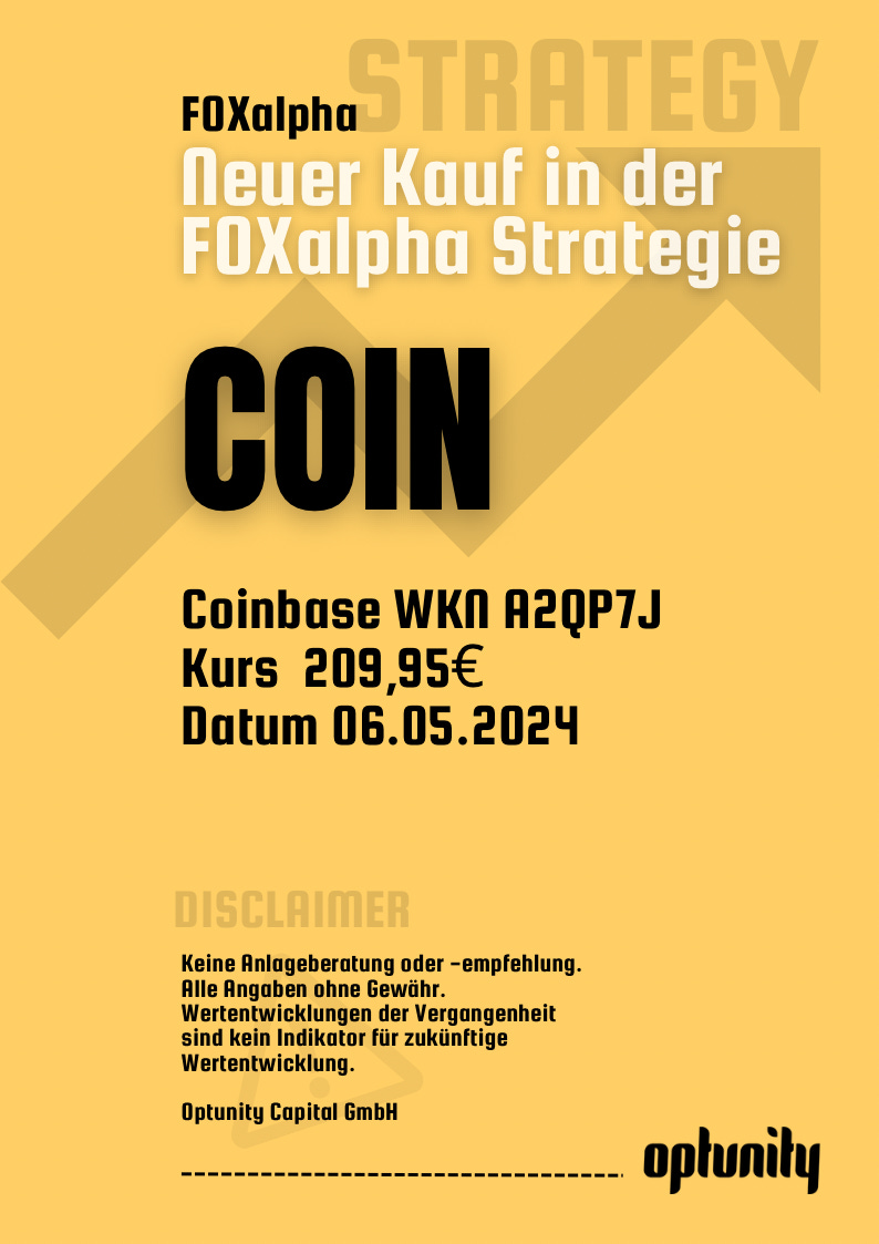 Neuer Depotkauf am 06.05.2024 für das FOXalpha Portfolio. Die Optunity Engine hat ein neues risikominimiertes Einstiegssignal für Coinbase generiert. Wir stocken die bestehende 10% Position um weitere 10% auf. Der Cashanteil reduziert sich damit von 30% auf 20%.