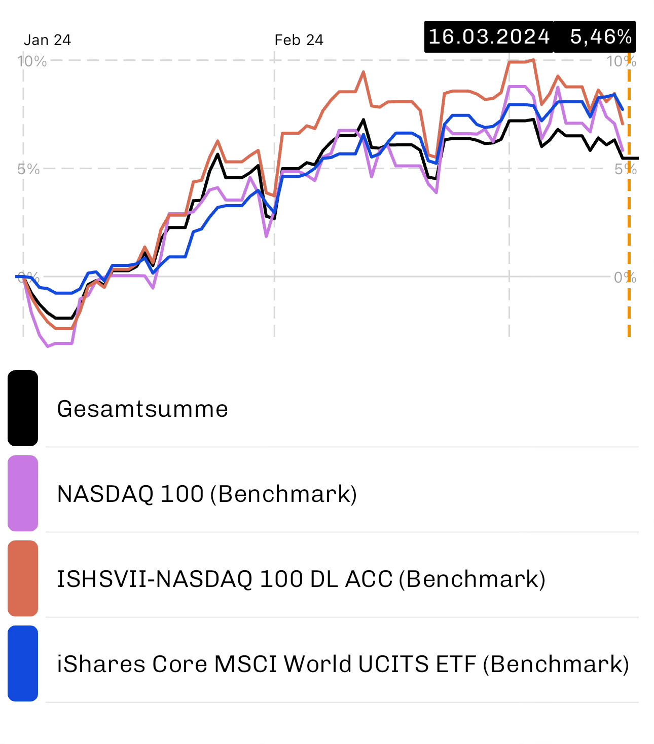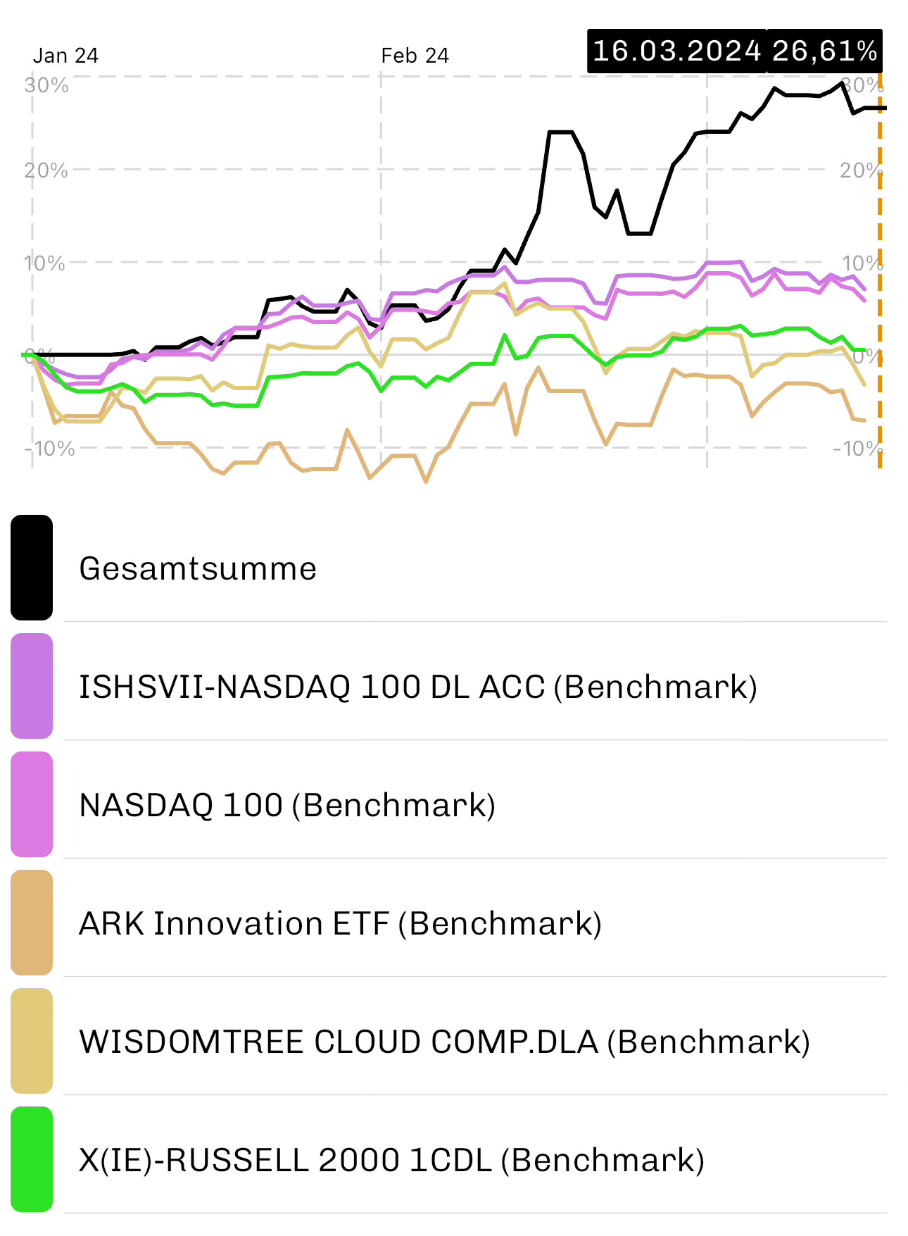 Nun die Performance des InvestiGATOR Nasdaq Depots seit Jahresanfang zum Wochenschluss am 15.03.2024.