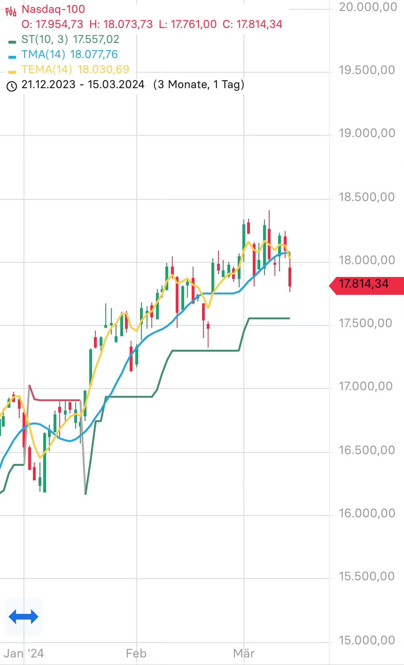 Noch ist nichts verloren, und der Gesamttrend im Nasdaq100 ist intakt. Allerdings sollte der Index nun zügig in den nächsten Tagen nach oben drehen, ansonsten wäre die langerwartete Korrektur da, und unser Risikomanagement würde greifen. Es ist jetzt AUFMERKSAMKEIT angesagt. :-)