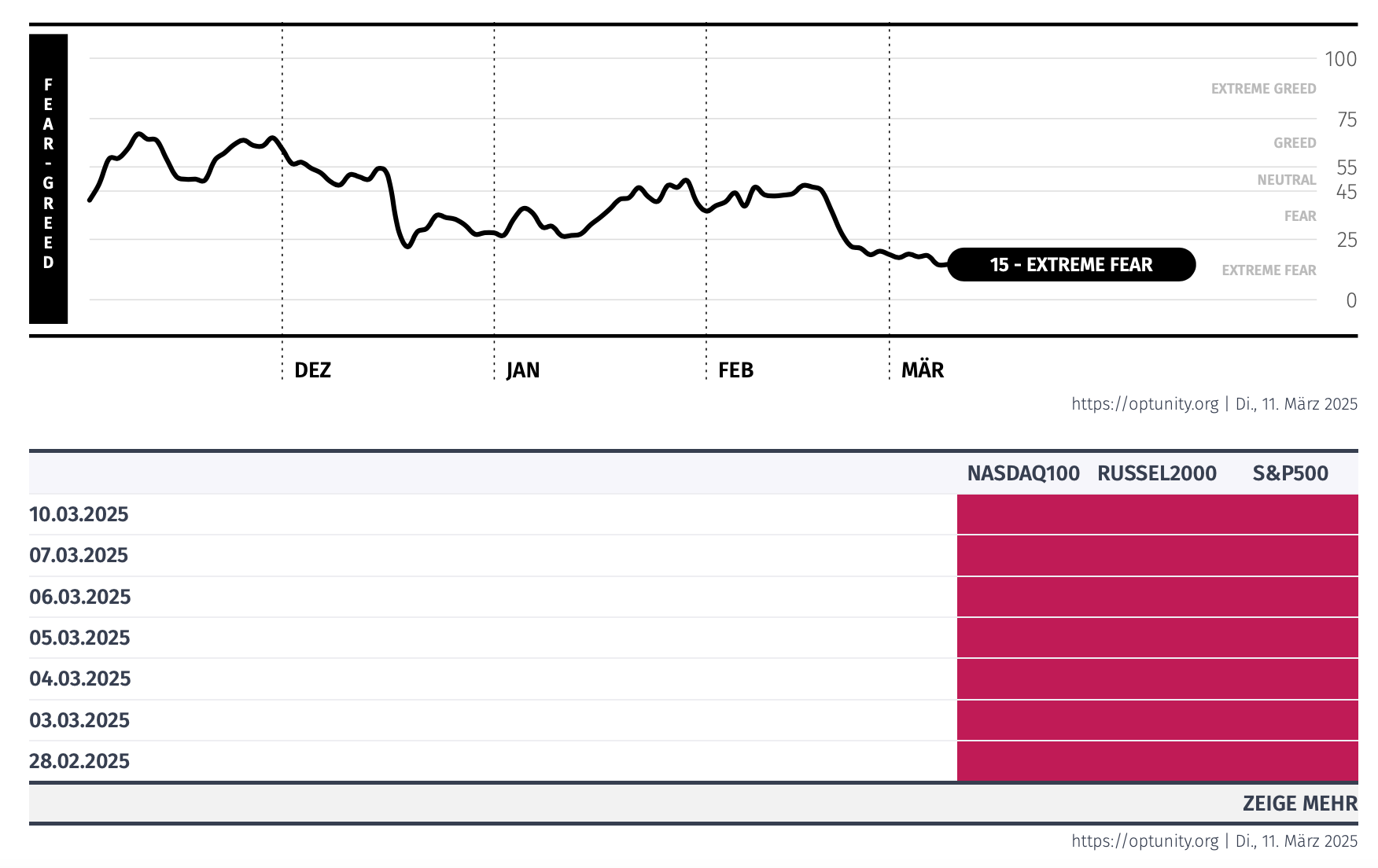 Leider zeigen auch die Marktindikatoren Fear and Greed und unsere Marktampel, die auf den gleitenden Durchschnitten basiert, extreme Panik an.