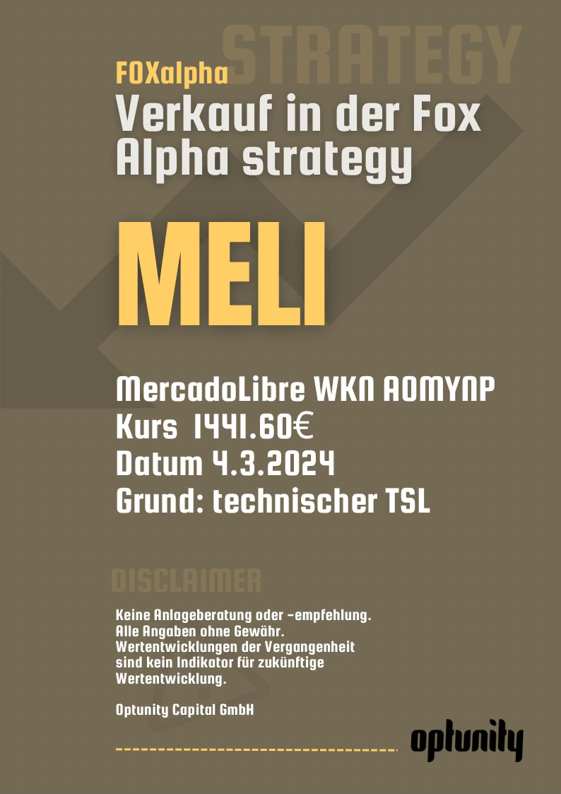 MercadoLibe konnte seit der Meldung der Quartalszahlen am 22.02.2024 nicht mehr überzeugen. Heute hat die Optunity Engine ein technisch definiertes Trailingstopplos Signal geliefert.